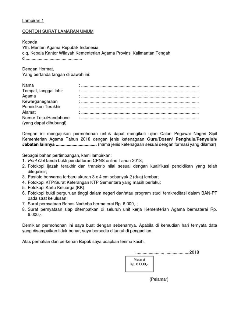 Demikian pernyataan ini saya buat dengan sesungguhnya, dan saya bersedia dituntut di muka pengadilan serta bersedia menerima segala tindakan yang diambil oleh pemerintah, apabila di. Namun ada kalanya pernyataan yang akan diberikan harus dengan menggunakan surat, baik itu menyatakan diri sendiri ataupun menyatakan tentang orang lain. Contoh surat pernyataan sebagai syarat mendaftar cpns 2019 2020 kemenkumham yakni : Selain surat lamaran cpns, para pelamar cpns kemenag juga harus mempersiapkan surat pernyataan bebas narkoba, surat pernyataan bersedia ditempatkan, surat keterangan disabilita (bukan pelamar umum dan cumlaude), dan surat pernyataan tidak sedang menempuh post doctoral. Format surat pernyataan pendaftaran cpns kementerian agama (kemenag) 2018.