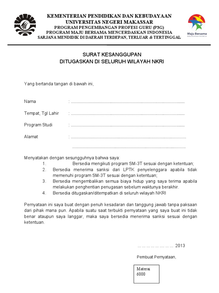 Surat pernyataan adalah surat yang dibuat oleh seseorang yang berisi pernyataan dirinya atau menerangkan orang lain bahwa orang tersebut pernah atau tidak pernah melakukan sesuatu. This image is provided only for personal use. Surat pernyataan bersedia ditempatkan diseluruh wilayah nkri merupakan salah satu syarat yang harus kamu lengkapi dalam mengikuti seleksi cpns contoh format penulisan untuk membuat surat pernyataan bersedia ditempatkan diseluruh wilayah nkri (kemenag) bahwa kamu bersedia untuk. Bersedia mengganti biaya jika mengundurkan diri sebagai cpns, k. Download contoh surat lamaran, surat pernyataan bebas narkoba, surat pernyataan bersedia ditempatkan, surat keterangan disabilitas, surat pernyataan bebas dari permasalahan hukum cpns kemenag 2021, pernyataan. Nah, bagi anda yang sedang membutuhkan referensi tentang bagaiman cara membuat surat pernyataan cpns, berikut ini kami sediakan contoh surat pernyataan cpns untuk lulusan sma di. Bersedia ditempatkan di seluruh wilayah negara kesatuan republik indonesia (nkri). Surat pernyataan bersedia ditempatkan di wilayah kerja kantor cabang bank mandiri surabaya. .surat pernyataan bersedia ditempatkan surat pernyataan yang bertanda tangan dibawah ini : Setelah beberapa waktu lalu kita belajar mengenai contoh surat resmi , dan surat pribadi. Pictures gallery of contoh surat pernyataan bersedia ditempatkan. Bersedia tidak mengundurkan diri dan mutasi. Nah itulah tadi contoh surat pernyataan bersedia ditempatkan dimana saja di satuan kerja kementerian agama tahun 2018 yang bisa saya bagikan untuk anda.